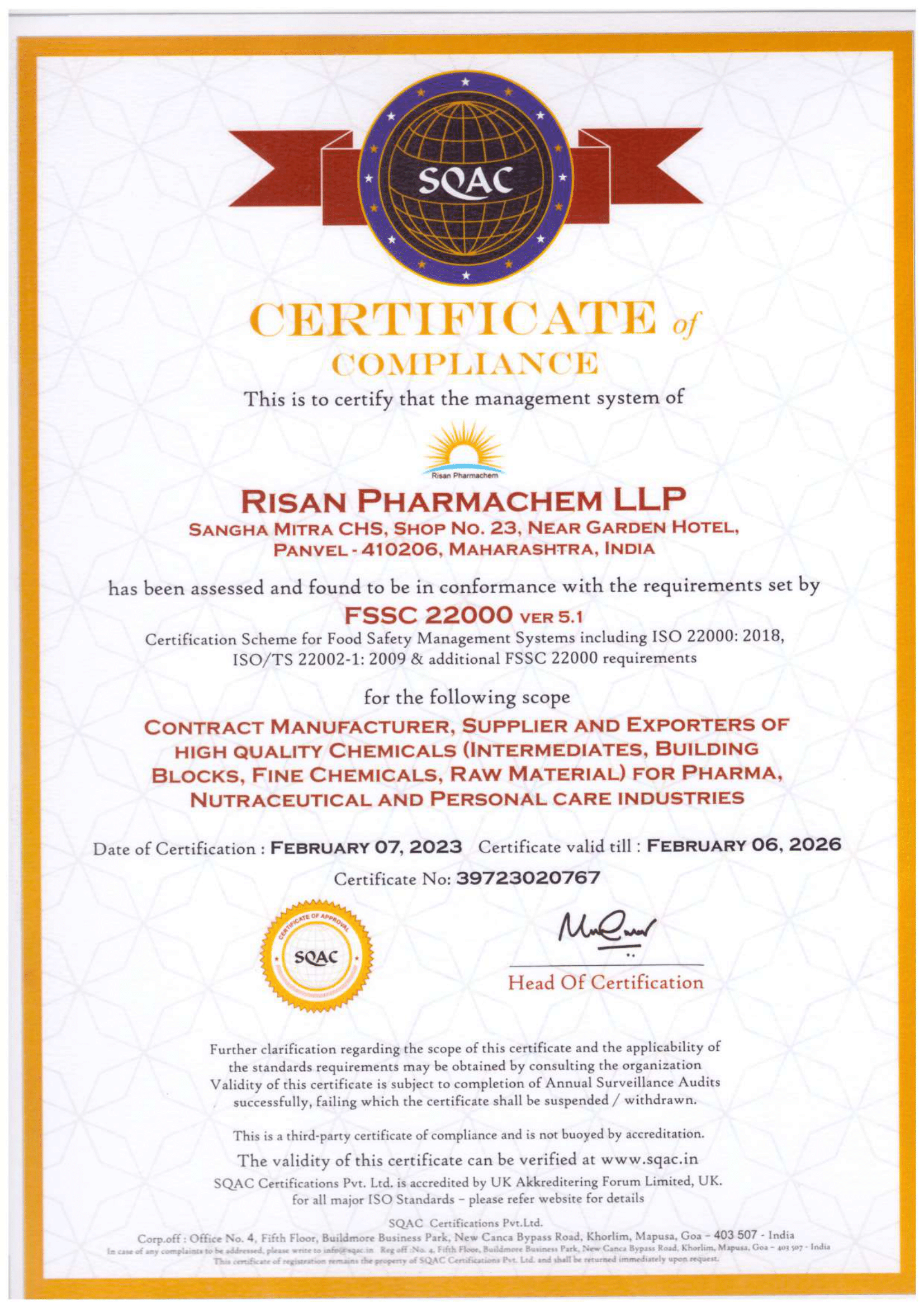 Risan Pharma is a Indian based company, engaged in offering high quality chemicals (intermediates, building blocks, fine chemicals, raw material) for pharma and nutraceutical industries. Risan Pharma is a customer-driven company. Our principle is "Good Quality, Quick Delivery, Competitive Price, and Best Service"! Comprehensive, effective communication and collaboration with our customers is a hallmark of our success.